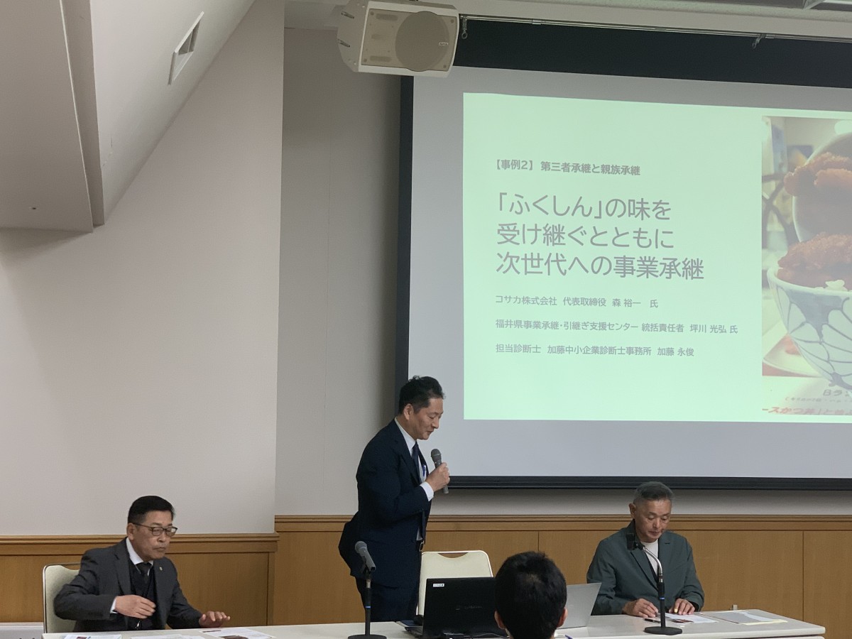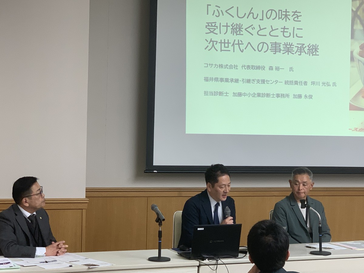 坪川光弘統括責任者からは福井県内の事業承継の現状と課題を、加藤診断士からは全国的ではありますが飲食業の事業承継の現状と課題をお話しいただきました。
