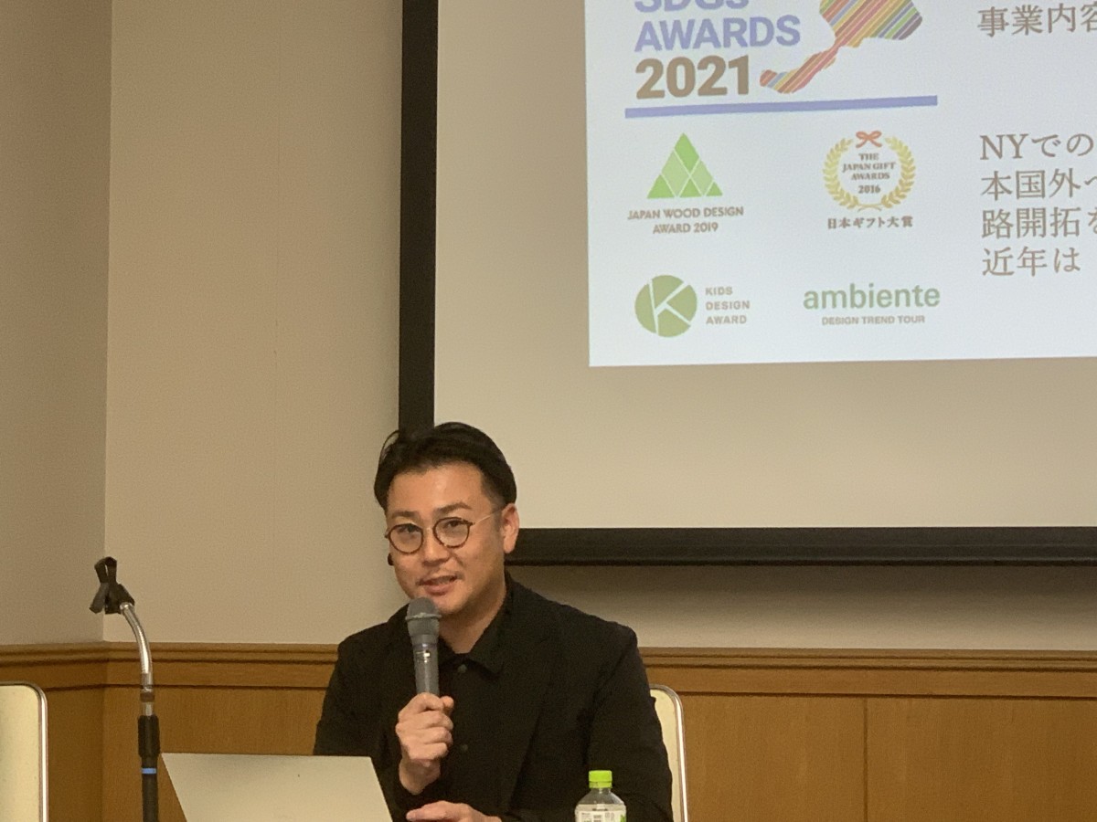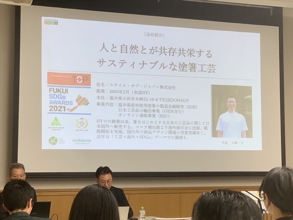 続いて大森一生講師から第2段階としてSDGs経営の実践事例の紹介を行っていただきました。大森一生講師は「人と自然とが共存共栄するサステナブルな塗箸工芸」の思いでSDGsを実践されています。福井県産間伐材を活用した塗り箸の開発・製造・販売事業に取り組まれ、原料から商品まで全て国内で賄う箸を拡販することで,原料の大半が輸入材という矛盾を解消し,CO2排出削減と森林・林業活性化に繋げ,さらに資源調達の持続可能性,産地の持続可能性を高められています。このSDGsの実践に伴い設定した課題の解決の活動により売上や販路拡大など多くの成果をあげられています。