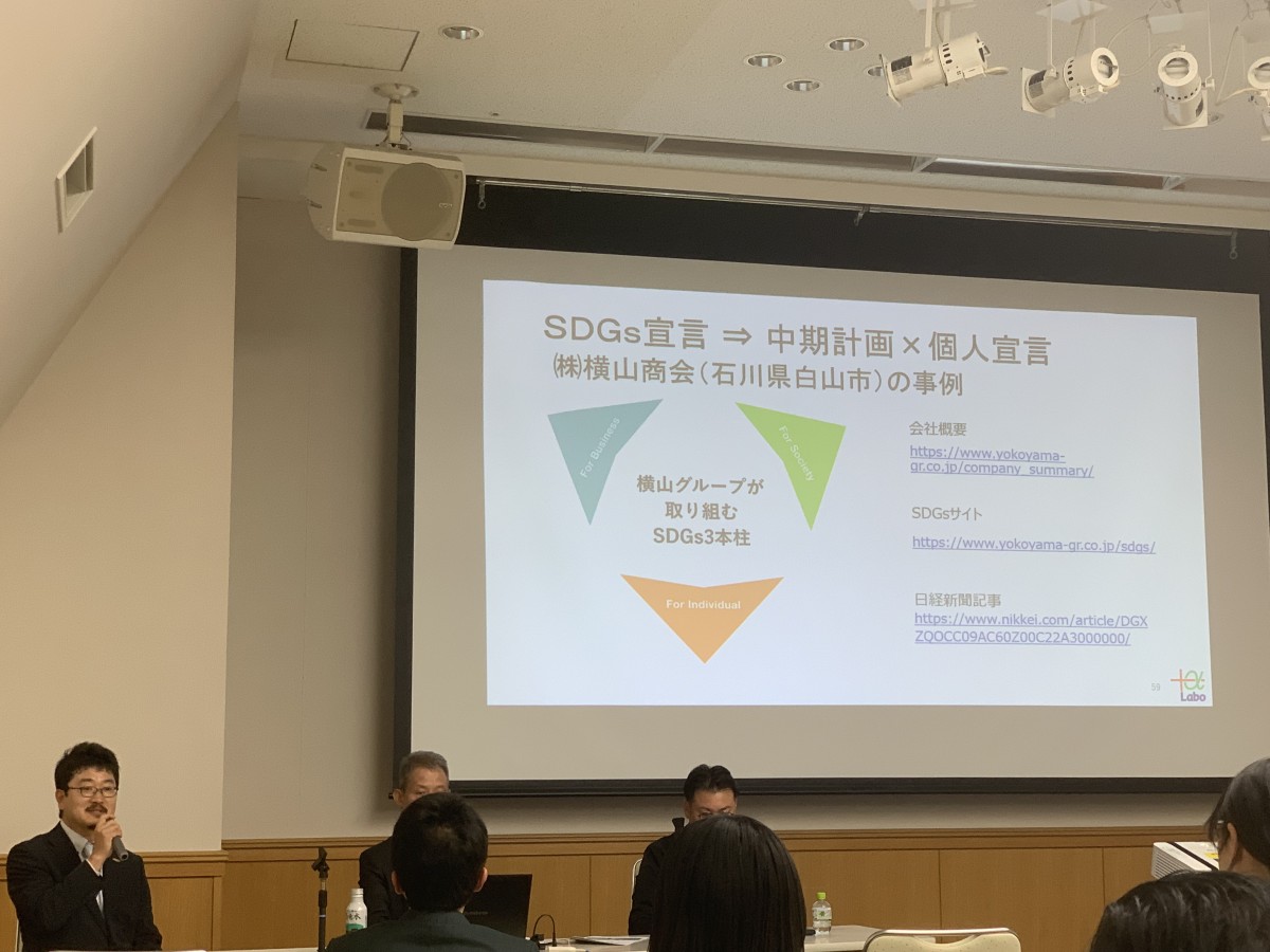 次に大田快津馬講師から第5段階のSDGs宣言の作成&内外への浸透・発信計画の作成事例として、中期経営計画とアクションプラン、SDGs宣言と株式横山商会で行われている「一人一宣言」をお話しいただきました。
